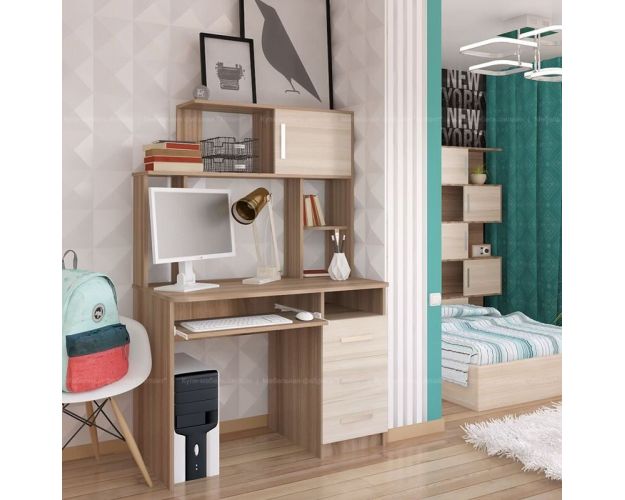 Компьютерный стол «Интел-12» имеет верхнюю надстройку создающую нишу под монитор, с полками под книги и канцелярские принадлежности – слева надстройки открытые полки, справа открытые полки и ниша за распашной дверкой. Под столешницей расположена тумба с тремя ящиками на роликовых направляющих.